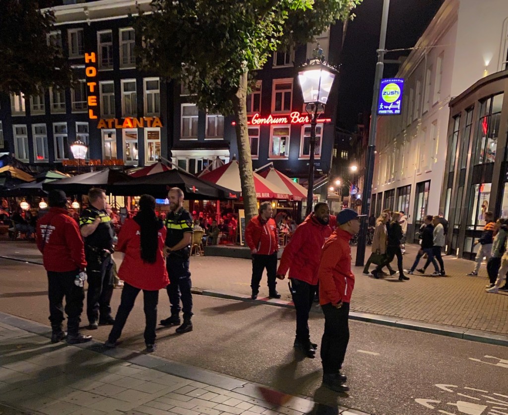 We didn’t see many police in this area even though it was very crowded at times. Instead Amsterdam practices some common sense crowd control. First cars and bikes are not permitted on the streets and pedestrian traffic is one way. The area does not allow drinking outside of bars and restaurants (with a 95 Euro fine if caught), although smoking pot is quite prevalent. Most conspicuous are the red-jacketed ambassadors. These men and women are here to HELP tourists with directions, rules and advice so they don’t get into any trouble in the area. It seems to work.