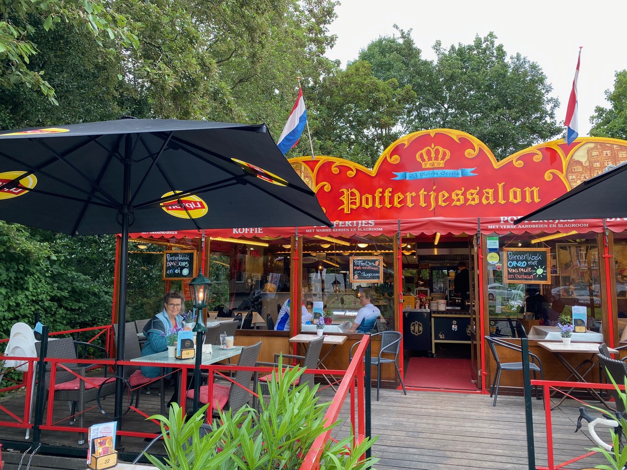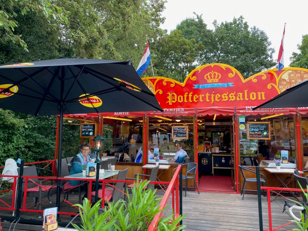 When impending rain made us look for shelter, we found this delightful pancake house, which serves pannenkoek (a large pancake) and poffertjes (little pancakes). After a great meal, we found out it was a cash-only restaurant and we had no Euros or debit cards with us. Fortunately the proprietor rescued us, taking our USD (not the norm) or we’d have been washing pancake plates for a long time. The Pieters-Geeris family sold their food at fairs for decades and opened this seasonal house of pancakes in Ouderkerk in 2013.