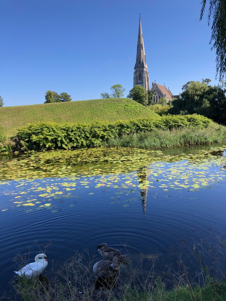We saw swans in open waterways across Copenhagen. These three are in front of St. Alban’s Church, swimming in a moat just outside the walls of the Kastellet (the Citadel), a star-shaped fortress built in 1626. The white swan is probably the mom. The two gray ones might be two younger swans, or cygnets, who still have their youthful coloration although they appear to be fully grown. As H.C. Andersen wrote in “The Ugly Duckling“: “It doesn’t matter about being born in a duckyard, as long as you are hatched from a swan’s egg.” They were all grooming themselves, plucking out tons of feathers, so maybe the mom was teaching the young ones to get rid of the gray.