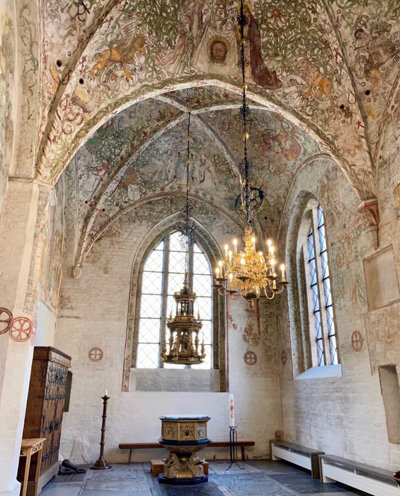 The baptismal font is in a side chapel known as the Chapel of the Merchants. The medieval frescoes are among the best preserved in the entire Nordic region. They were whitewashed during the reformation but in 1906-1907 they were restored. The floor is actually gravestones.