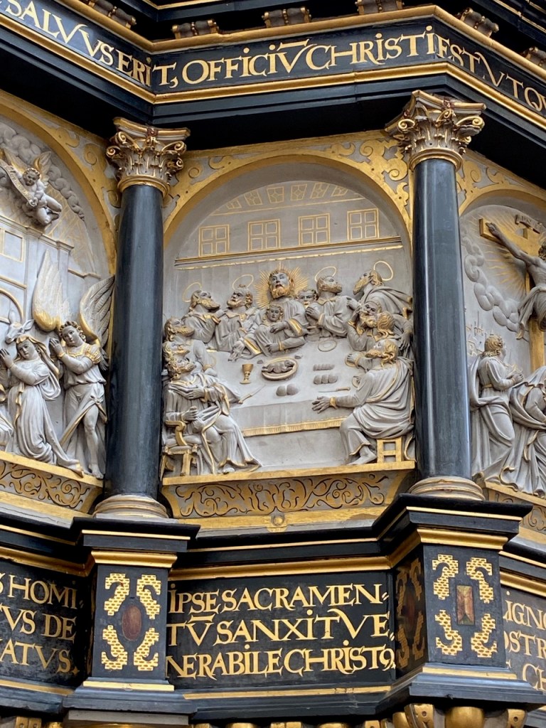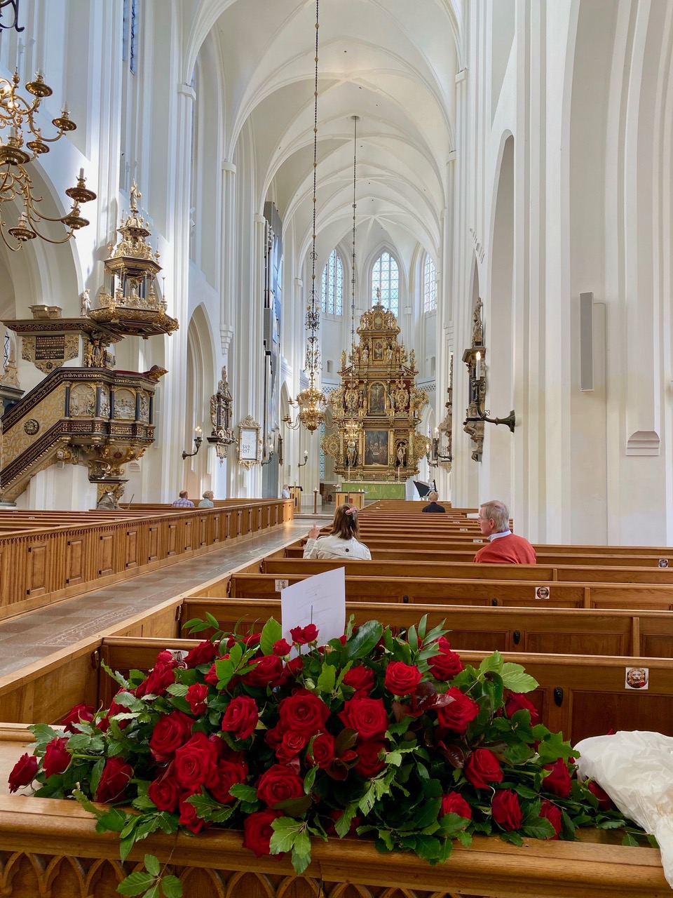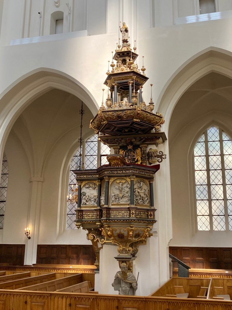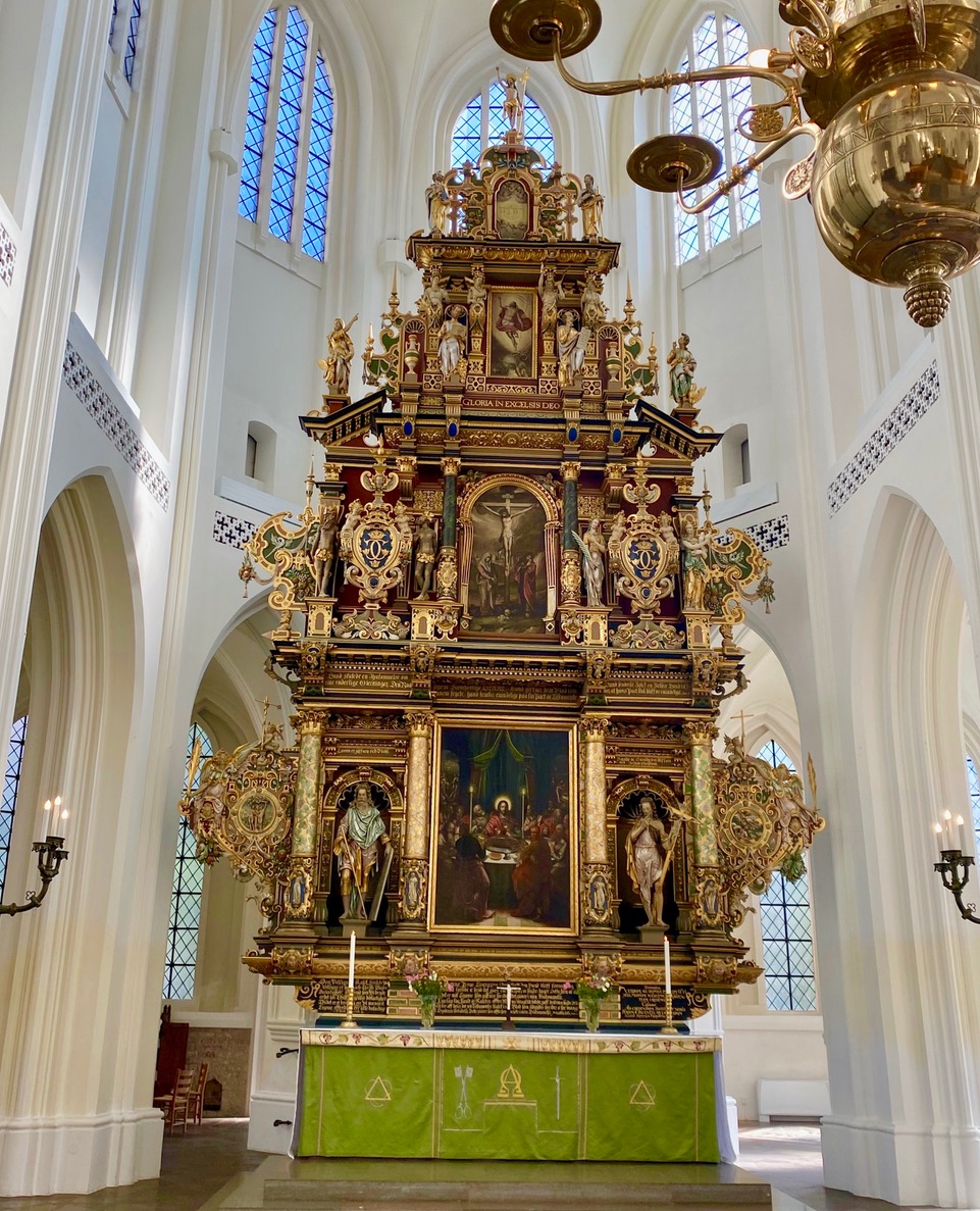 The sanctuary is bright and airy after the 1555 whitewashing. More than 60 Lady altars were removed from the sides during the Reformation. When we visited on a Thursday afternoon a service began, but there were only a handful of attendees. It wasn’t clear whether that was COVID-related or people simply wanted to enjoy the beautiful day outside.