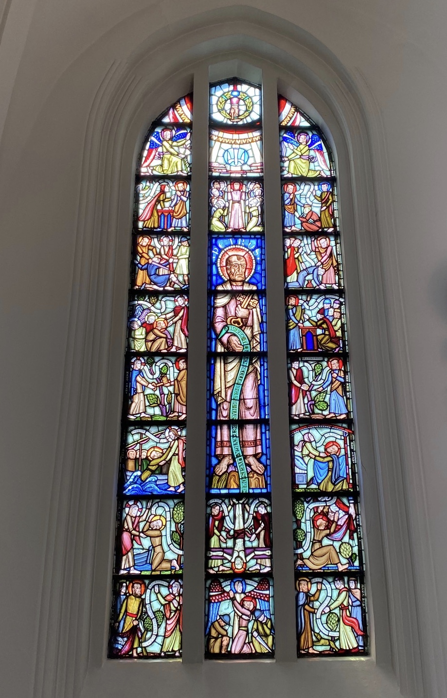 Saint Peter appears in one of the tall stained-glass windows. (St. Paul has a matching one.) The windows tell the story of their lives from becoming disciples to being martyred.