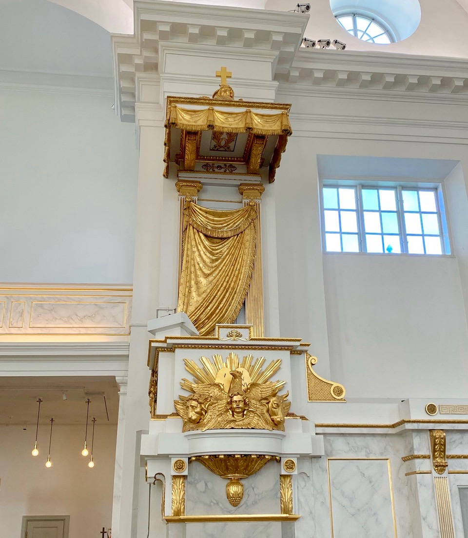 Here’s a side pulpit described as Empire style. Its elegant style does appear to be fit for a Roman emperor. Everything is gold: evangelists, angels, pinecones and the drapes.