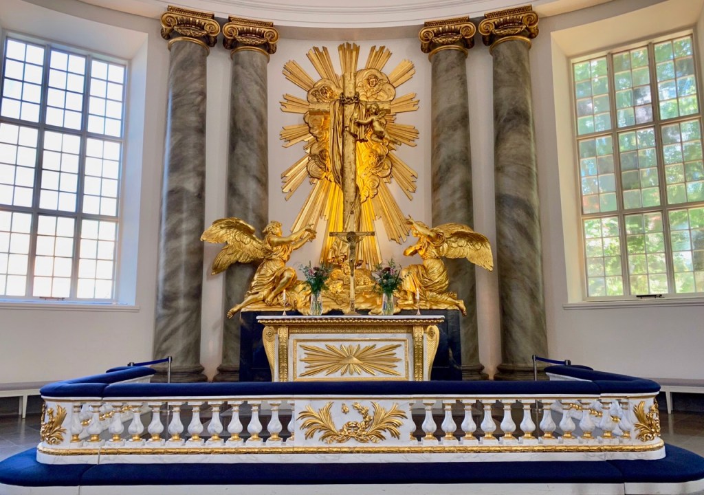 The two stunning angels were rescued intact from the 1802 fire. The rest of the altar is gilded wood reconstructed after the fire. The theme is the empty cross as it appears after Christ’s resurrection. The style could be described as high imperialism, neoclassical rococo or contemporary with the cathedral overall.