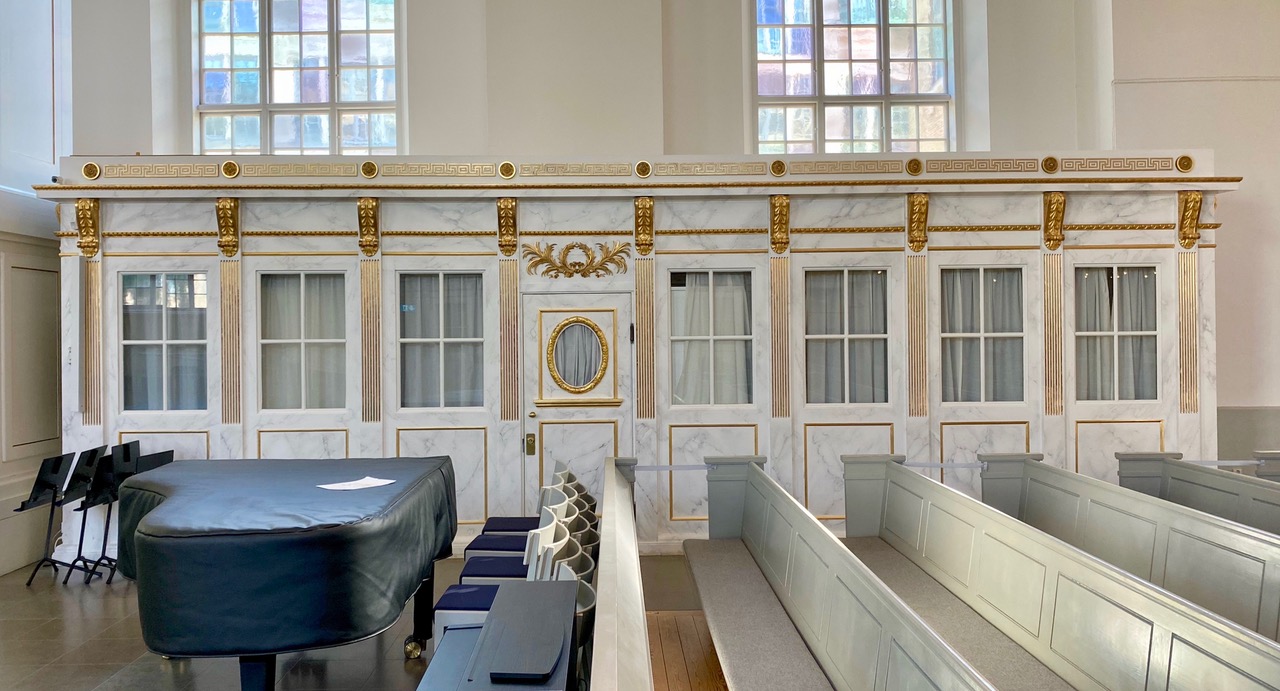 We haven’t seen this in Protestant churches before. Confessional booths were installed in 2002 on both sides of the pews. The guide says, “Confessions are now held in Protestant churches but are not considered a sacrament as in the Catholic church.” The guide also says the congregation jokingly refers to them as the “trams.” See the sanctuary picture for another view.
