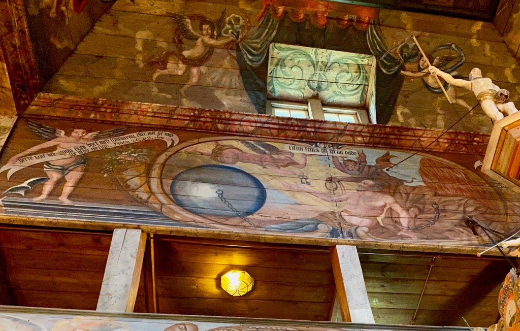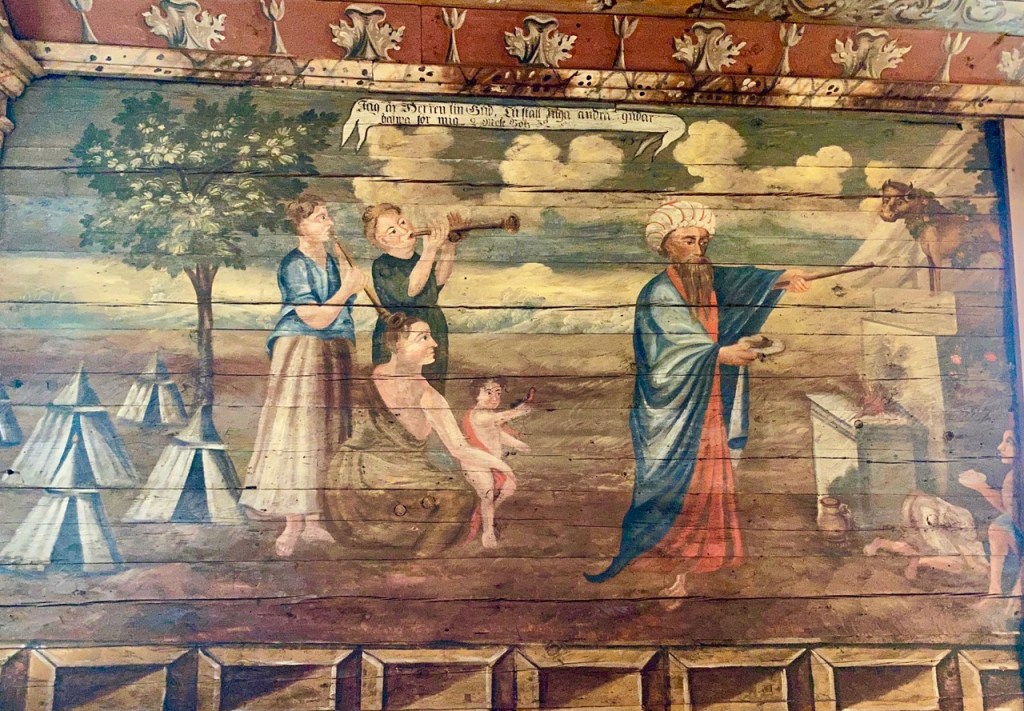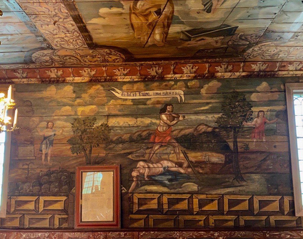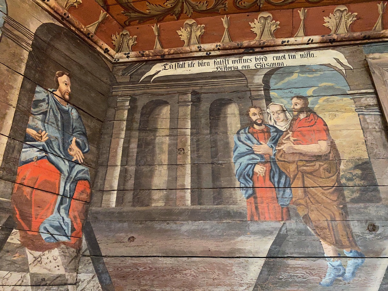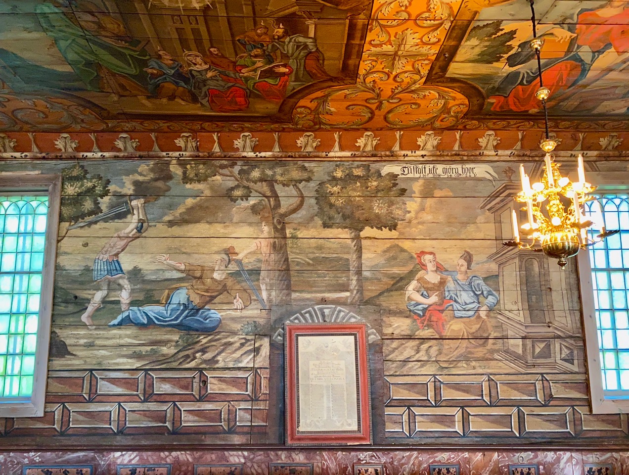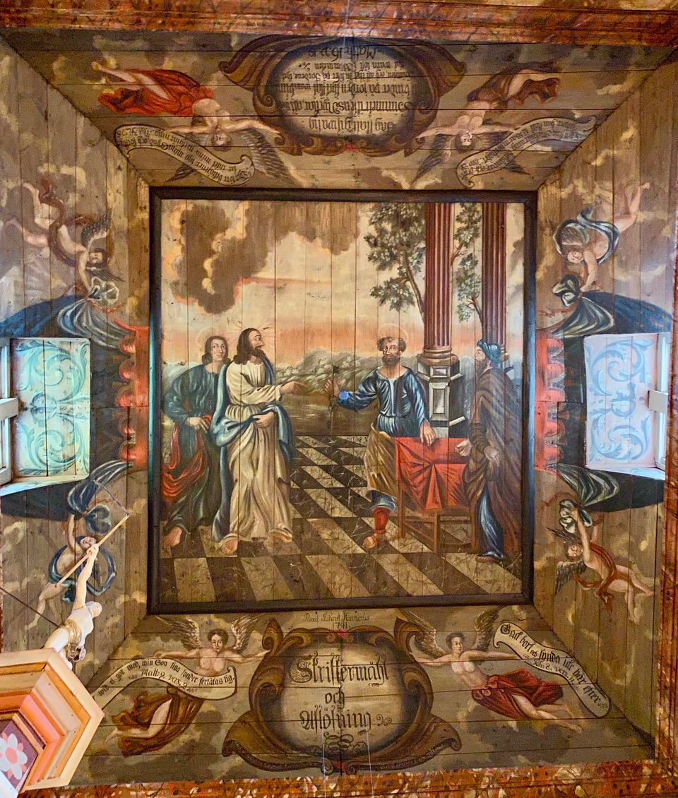 The stunning interior of Habo Kyrka was painted by two of Jönköping’s master painters, Johan Kinnerus and Johan Christian Peterson, along with their apprentices, Joachim Conrad Schwartz and Peter Edberg. For their work they were paid 1000 riksdaler. This sum included the artists’ providing their own paint, which they made from scratch. We think this amount would be about $55,000 US today, not a lot for three years of work from four people. Kinnerus’s style was old-fashioned and his colors generally dark. Peterson had a more modern style with lighter and brighter colors. As you look at the paintings you will begin to see who painted which scenes. The style of the art is called “Peasant Baroque,” an appropriate description for art that is simple yet dramatic.