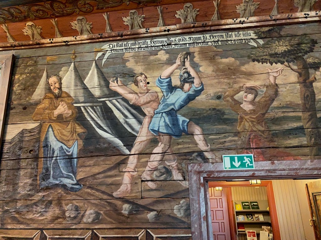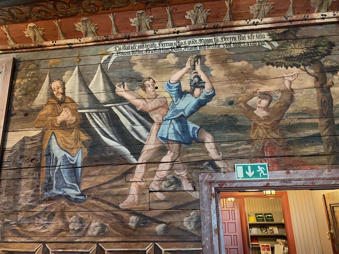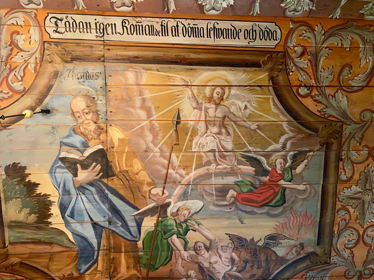 An additional bit of background: According to Präst Andreas and the church guide, when one of the artists was painting the devil in the “…but deliver us from evil” portion of the Lord’s Prayer high up near the ceiling, the devil said to the artist, “I am ugly but not as ugly as you have painted me. And now I will make you even uglier!” The painter fell off the scaffolding. He was injured and said he was not coming back because the devil had gotten him. The congregation was not happy because they had a contract with him to paint the entire church. A legal lawsuit ensued and the judge told the artist he had to honor his contract, so reluctantly he came back and completed the work in the church. Thank goodness for contract law!