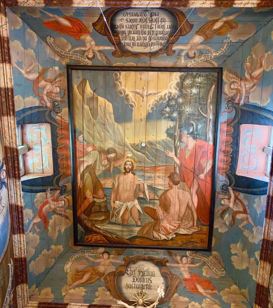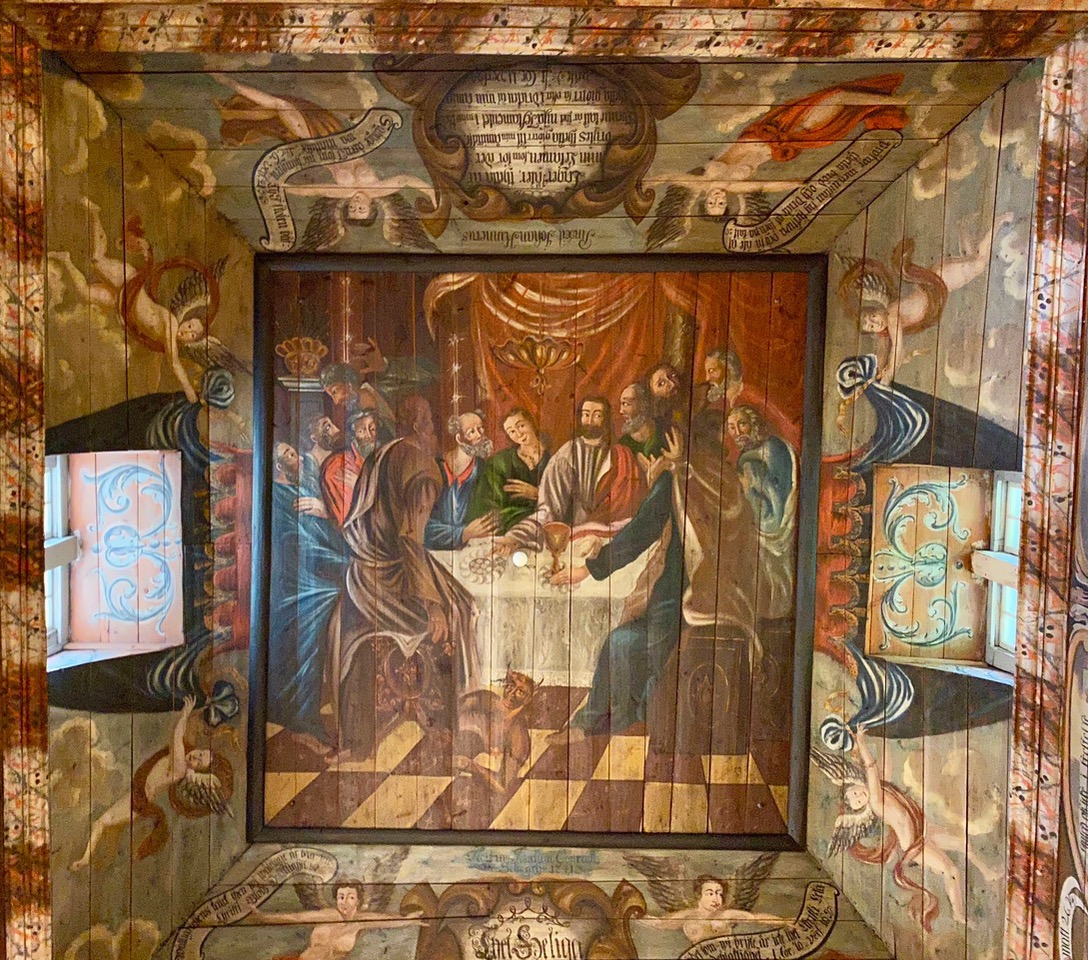 It’s almost impossible to find a spot inside Habo Kyrka that is not covered with paintings with meaningful lessons, all painted on the original wooden planks of the walls and ceiling. The ground floor has the Ten Commandments. The Apostles Creed is below the galleries and the Lord’s Prayer is above the galleries. The ceiling has important biblical scenes such as the baptism of Jesus and the Last Supper. In essence the entire interior of the church is an illustrated guide to Luther’s Small Catechism, which all parishioners were expected to have memorized. Given low literacy rates centuries ago, the very detailed paintings were exceptional visual aids for communicating religious stories repetitiously and helping parishioners to remember them and reflect upon them over and over. Luther said, “If anyone does not seek or desire the Lord’s Supper at the very least four times a year, it is to be feared that he despises the Sacrament and is not Christian.” All the parishioners had to do was look up each week to be reminded.