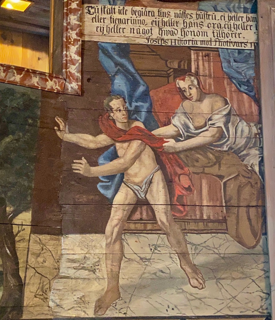 The 8th commandment. The text says, “You shall not bear false witness against your next. The story of Susanna.” (“Next” is how Swedes translate what we translate as “neighbor.”) We understand from the writing that the picture illustrates the story of Susanna, but there is no Bible reference, and this is quite a tricky one because the very interesting story of Susanna is found in the apocryphal addition to the book of Daniel.