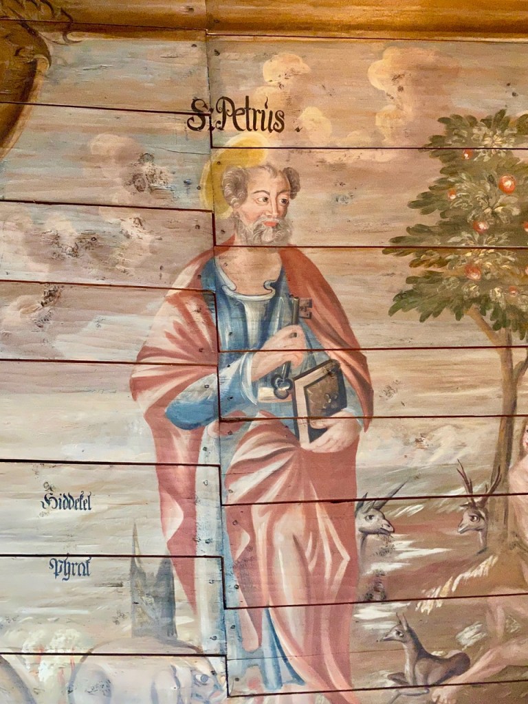 Präst Andreas shared some insight on the depiction of Saint Peter holding a key. Two words are written to the left of him: “Hiddekel” and “Phrat,” which mean Tigris and Euphrates, two of the four waterways that separated from the river that flowed up from the garden of Eden (1 Mos 2:10-14). The old Persian name for Hiddekel was Tigra, and this is the origin of the Greek name Tigris. In Arabic it is called Shatt Dijla. The twin rivers Tigris and Euphrates water the Mesopotamian plain. One theory is that the place where Eden used to be is now situated in the Persian Gulf and that it was covered by water thousands of years ago. The connection to Saint Peter here is not obviously clear, but there is a luscious fruit tree to the right of him, so most likely Saint Peter is standing in, or just outside, the garden of Eden, to which he has been given the key.