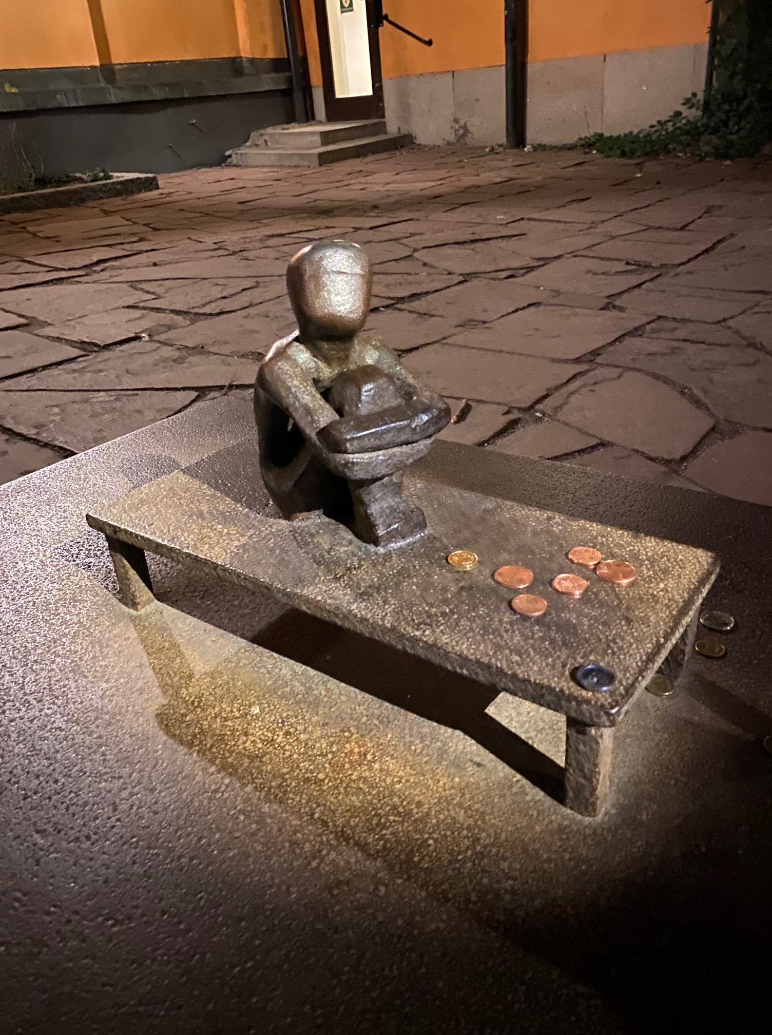 We visited one of the smallest statues in the world, “Järnpojke,” “Iron Boy” or “Little Boy Looking at the Moon.” It’s about six inches tall, barely taller than its names are long! The idea behind this artwork by Liss Eriksson is that the boy (perhaps Liss himself) couldn’t sleep, but looking up at the moon calmed him and sent him off to dreamland. Stories suggest good luck or a return to Stockholm for anyone who leaves a gift or rubs his head. That explains the shine. Our tour guide told us if we rubbed the boy’s head we would get pregnant. No news yet on that front…