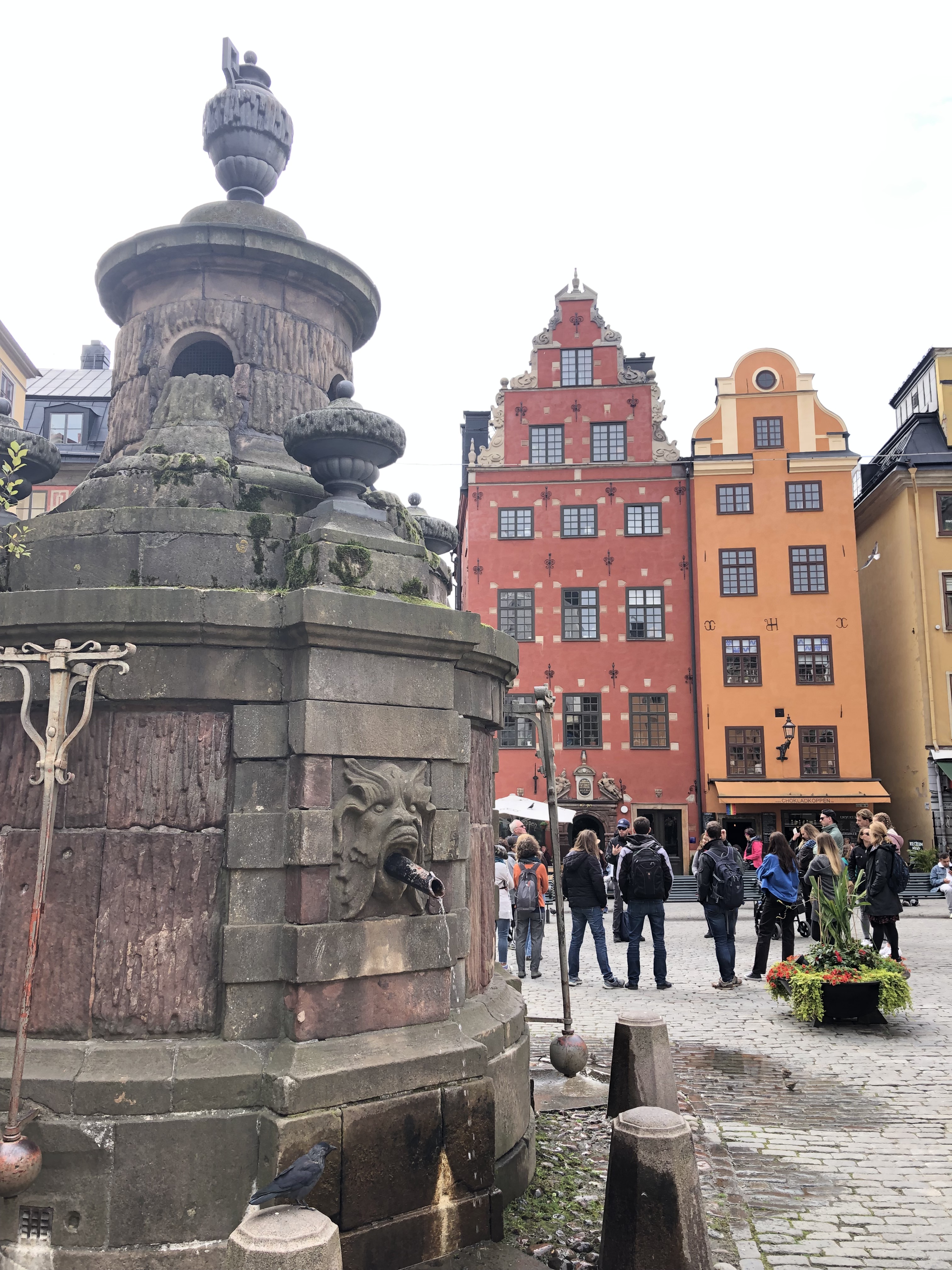 One of the top photo backdrops is the distinctive and pleasing architecture of number 18-20, brightly painted in orange and red. The Nobel Prize Museum is also on the square, celebrating the winners of prestigious prizes endowed by Alfred Nobel, the inventor of dynamite and other tools of war. Despite the peaceful appearance, the square was the site of the Stockholm Bloodbath, a three-day execution by decapitation of nearly 100 Swedish royals and aristocrats in 1520 by the Danes. They worked with the Archbishop of Uppsala to justify the killings because of the heresy of the accused: a fine example of religious justification of violent acts. Count the white squares in the red building, said to match the number of people beheaded. According to legend, blood ran into the well in the center of the square and spewed out tainted pink water for weeks. Stortorget’s well from the 1700s was removed after the square rose above the water level, but reinstalled in the original spot in the 1950s. Today the water trickling out is actually sourced via pipes from Stockholm’s pure, fresh, clean city supply. Good to know.