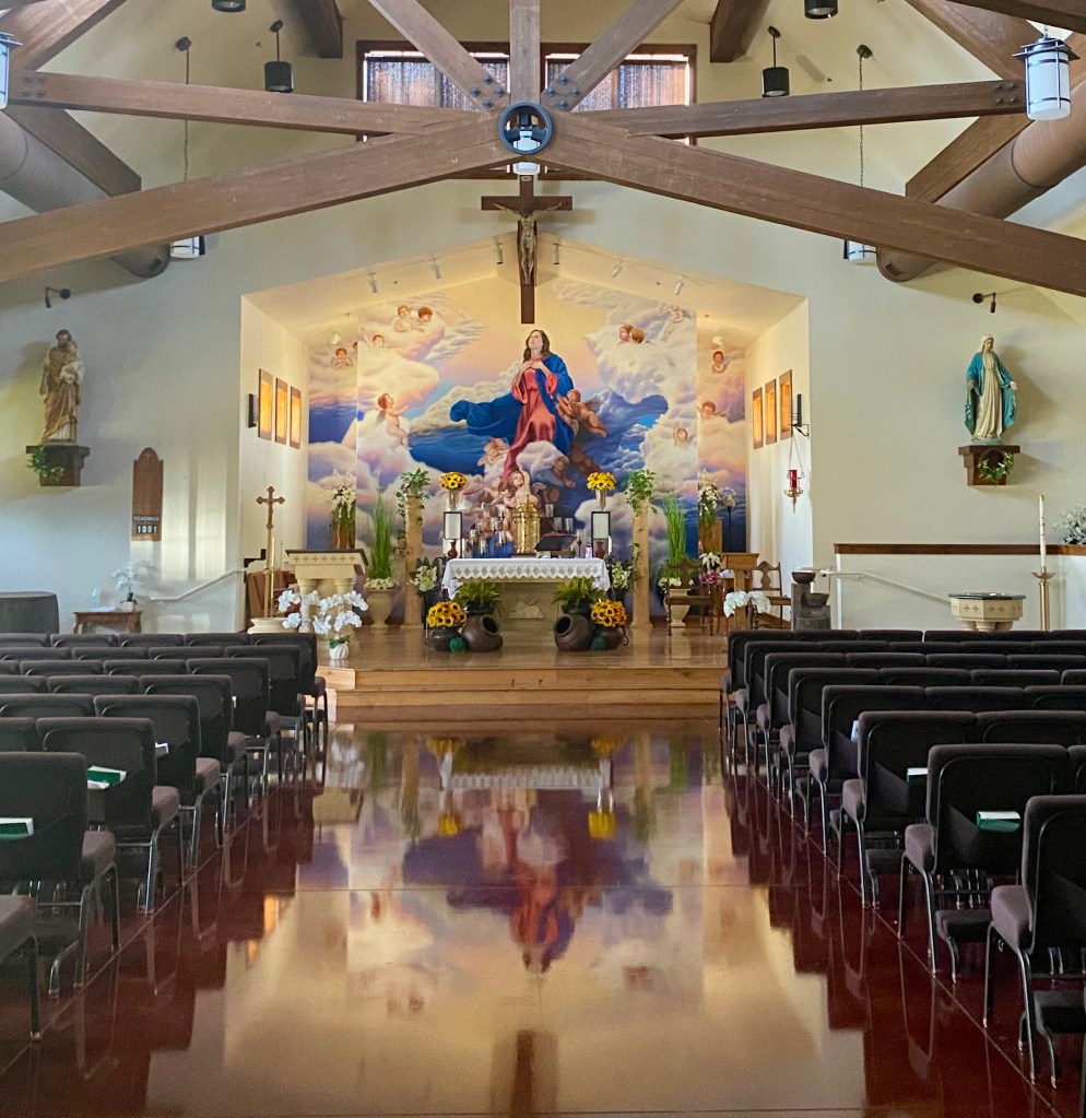 The altar has a colorful backdrop of the Assumption of the Virgin Mary which reflects beautifully in the polished floor of the church.