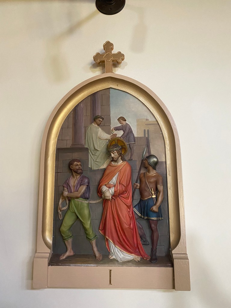 The Stations of the Cross are simple and literal. Here in the First Station, Pontius Pilate is depicted in the act of washing his hands of the condemnation of Jesus Christ.
