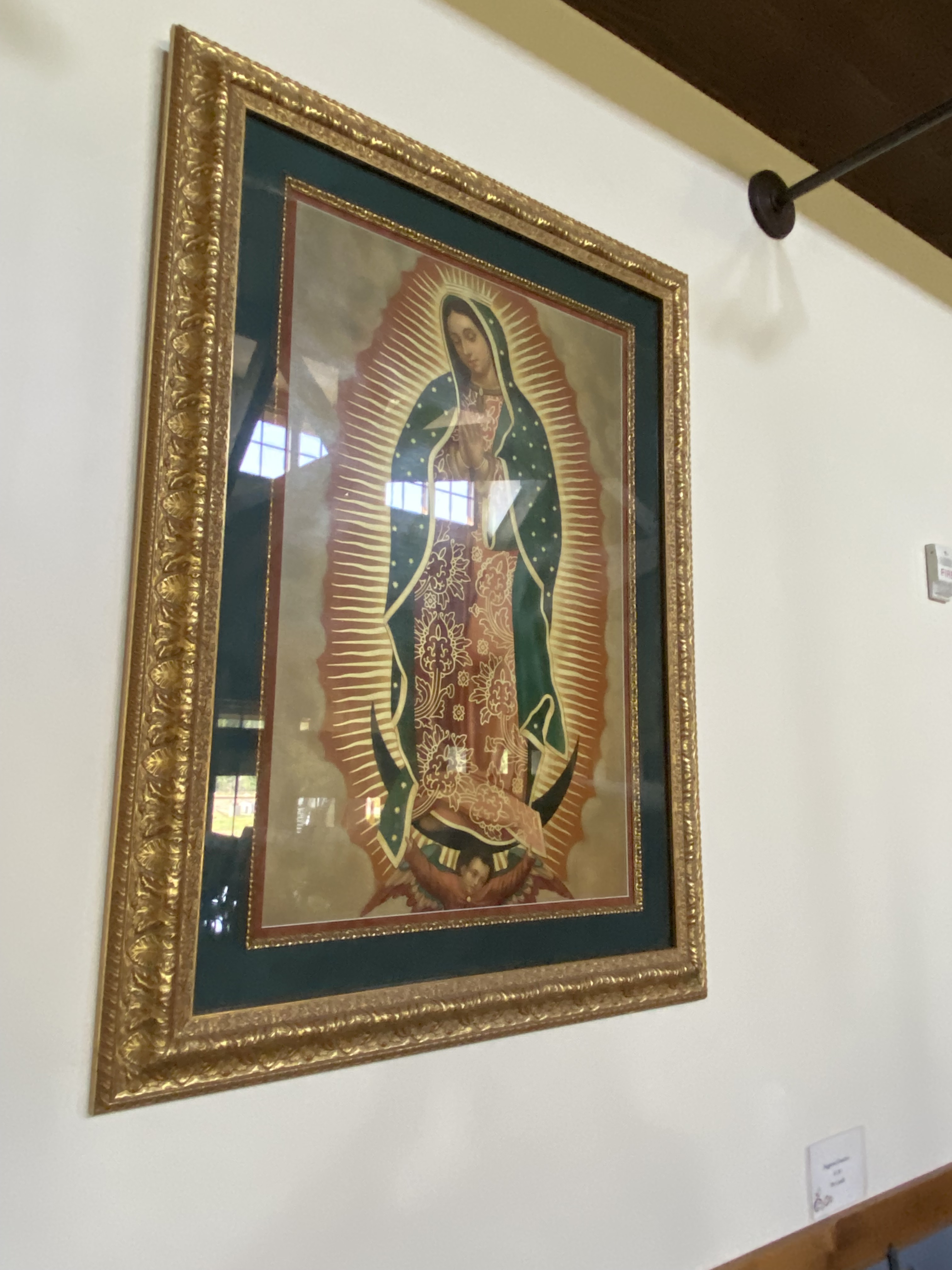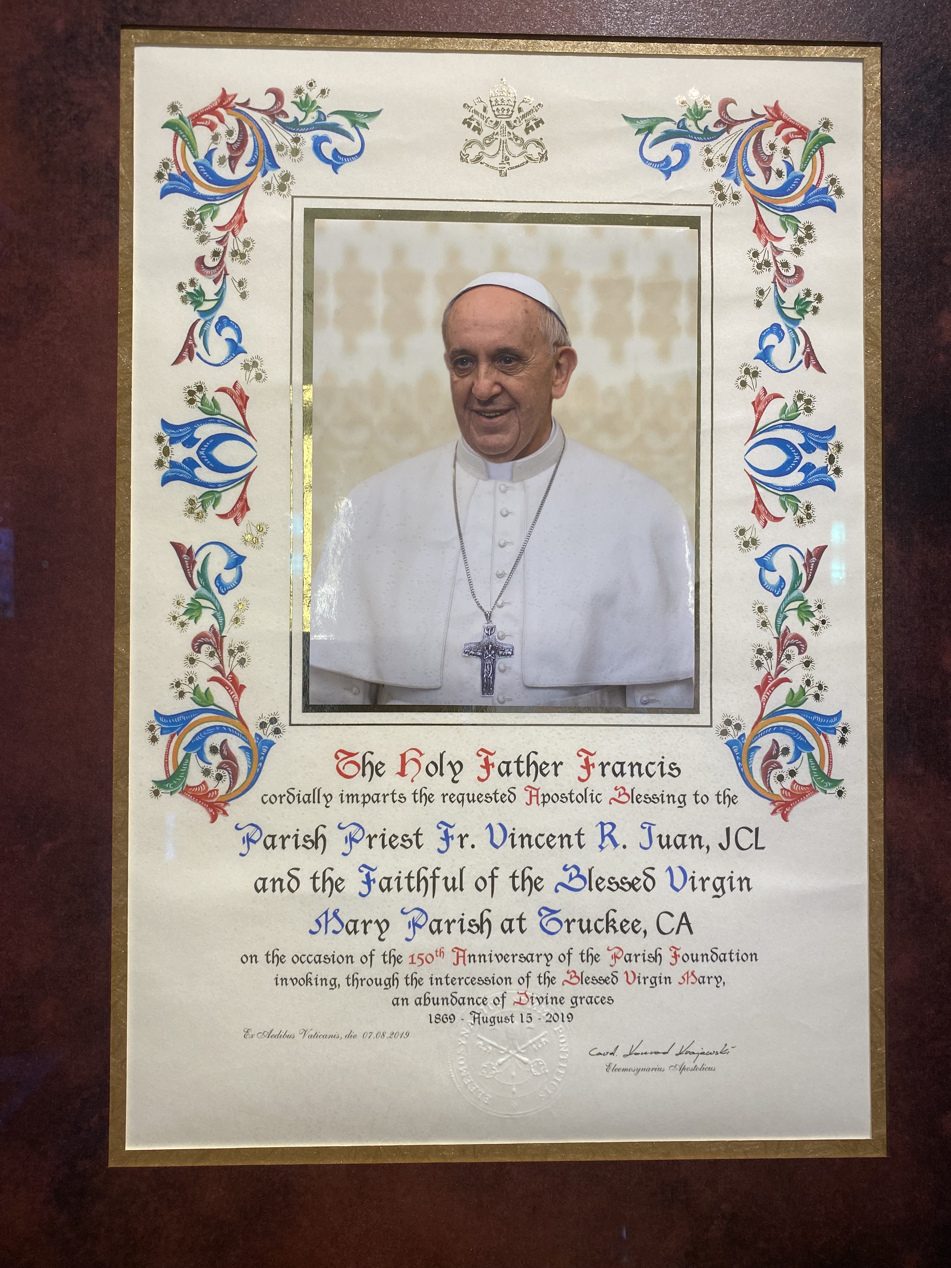 Today, the congregation is made up of both Hispanic and non-Hispanic parishioners. The pastor, Rev. Vincent R. Juan, delivers sermons in either English or Spanish. There is a sister church, Our Lady of the Lake, in nearby Kings Beach on Lake Tahoe. As expected, the Virgin of Guadalupe, popular among Mexican and Latin American parishioners, has a prominent position on the wall.
