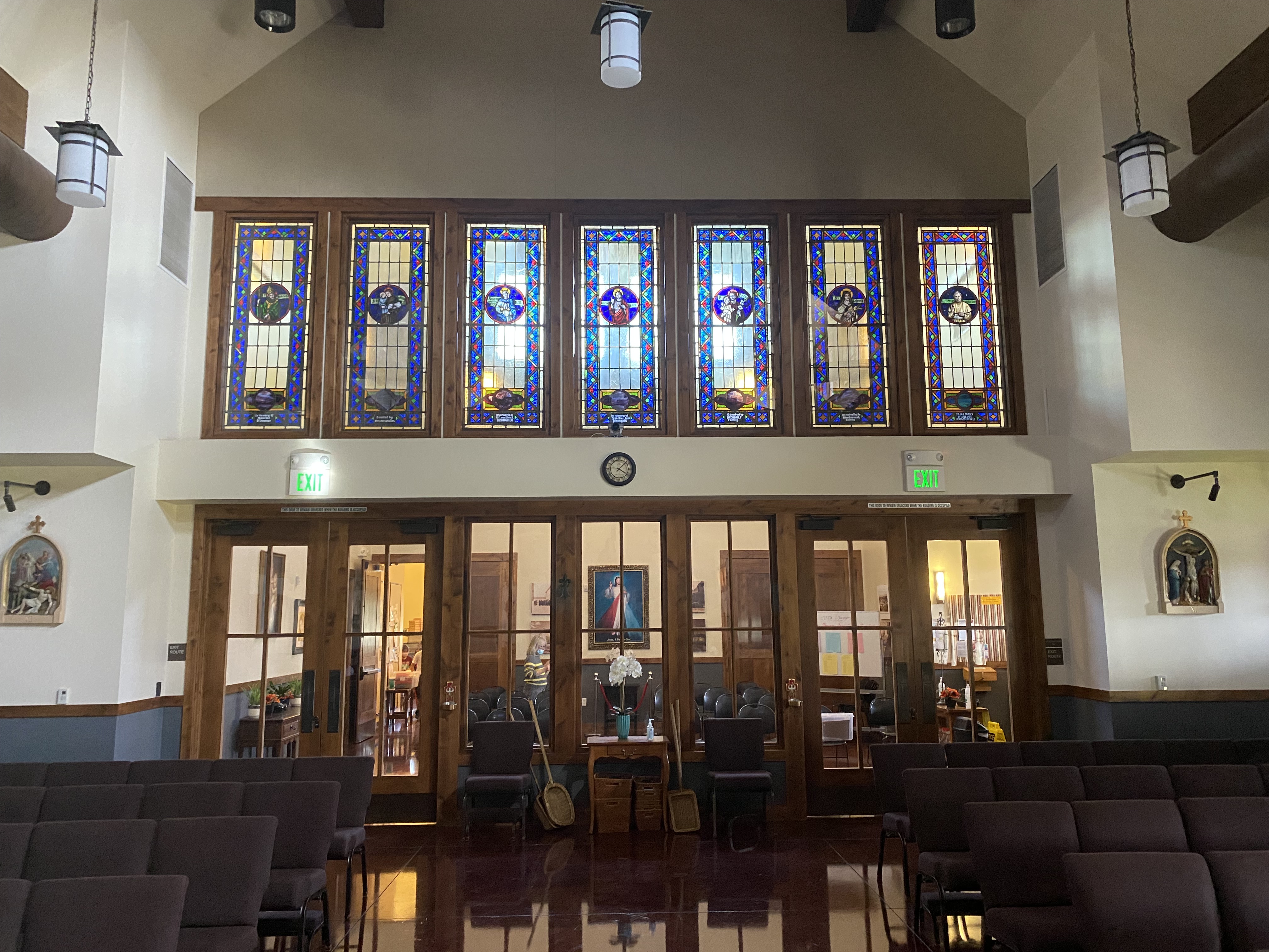 Inside the church are seven lovely stained-glass windows. Scenes depict the Sacred Heart of Jesus, the Assumption of the Blessed Virgin Mary, Pope Saint Pius X, Saint Joseph, Saint Anthony, Saint Patrick, and Saint Therese of Lisieux.