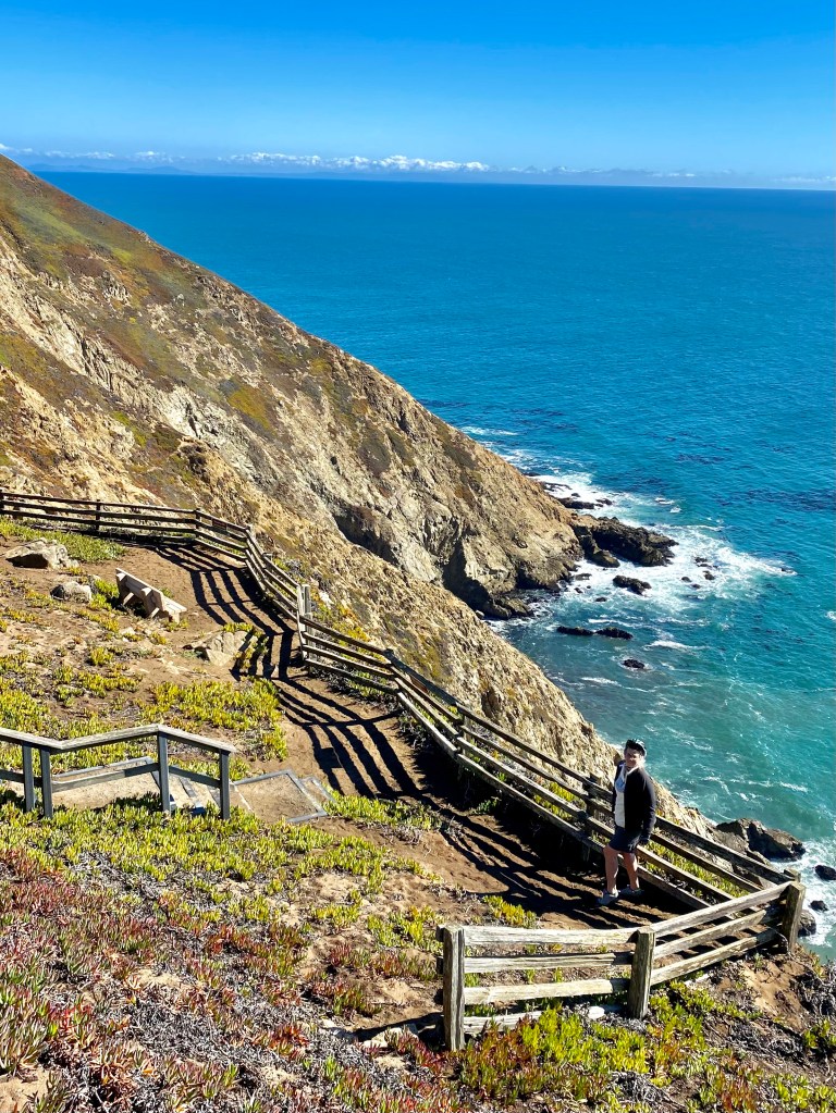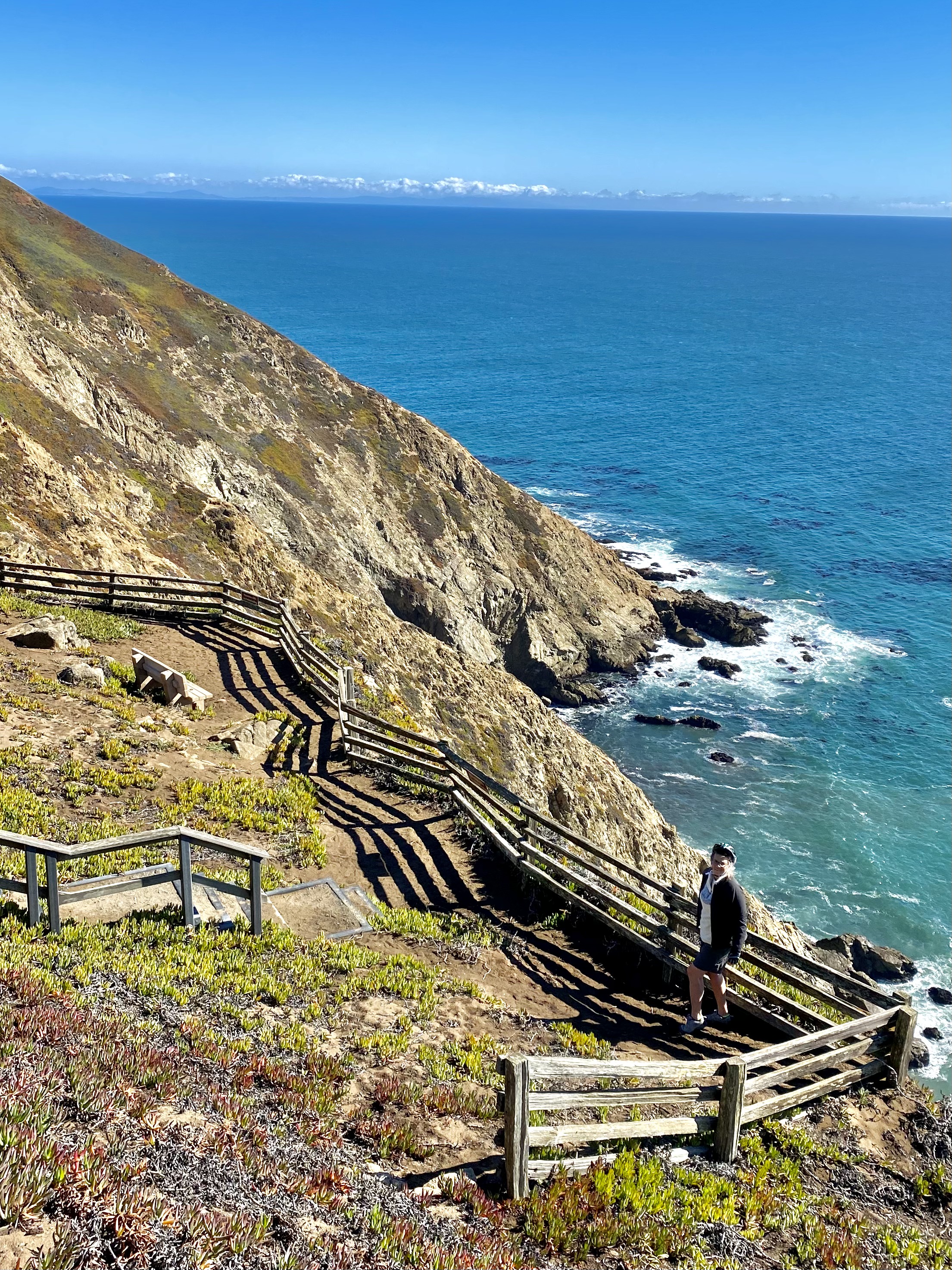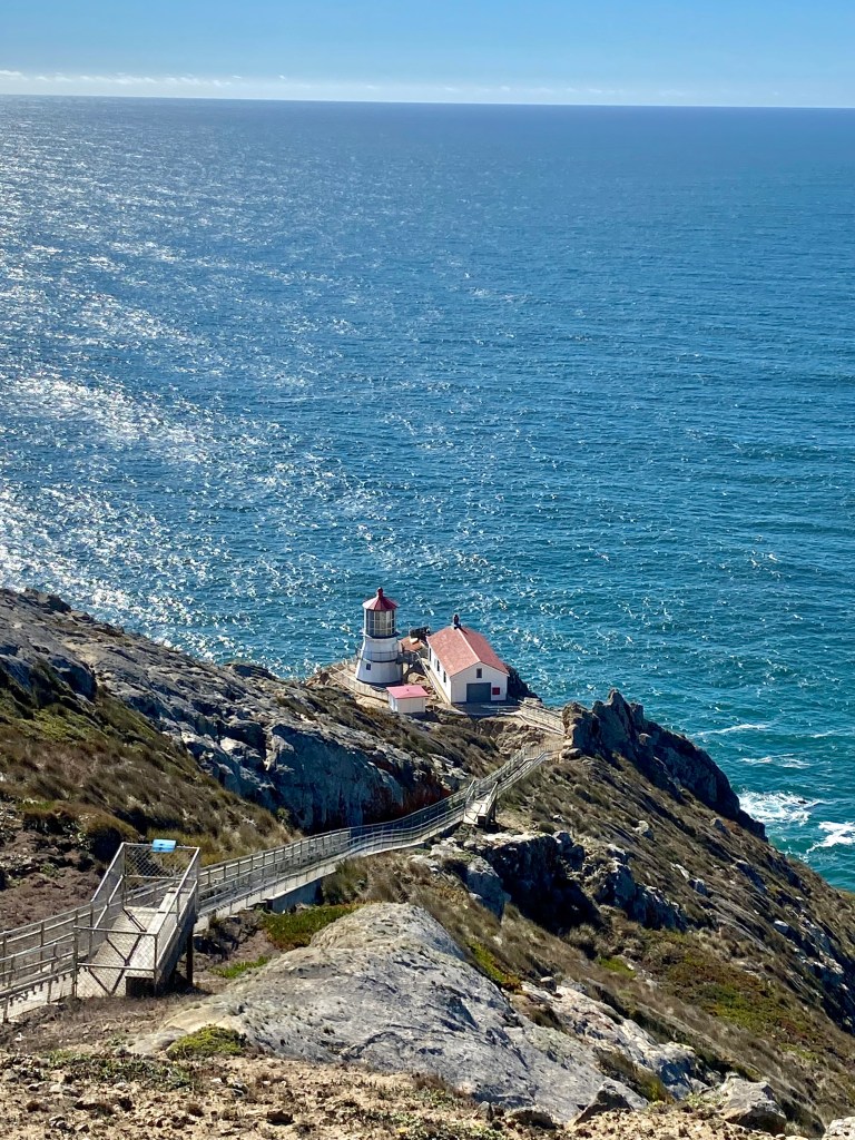 Finally, the lighthouse itself…Point Reyes Lighthouse was built in 1870 and operated as a manned station for more than a century. Now an automated light and fog horn are in place near the historic site to provide important navigational aid around the rocky shoreline. Stephen has climbed down and back up the 313 steps to the buildings, 25 stories! Unfortunately (or fortunately?) the stairs were locked off during our visit so we couldn’t make the descent.