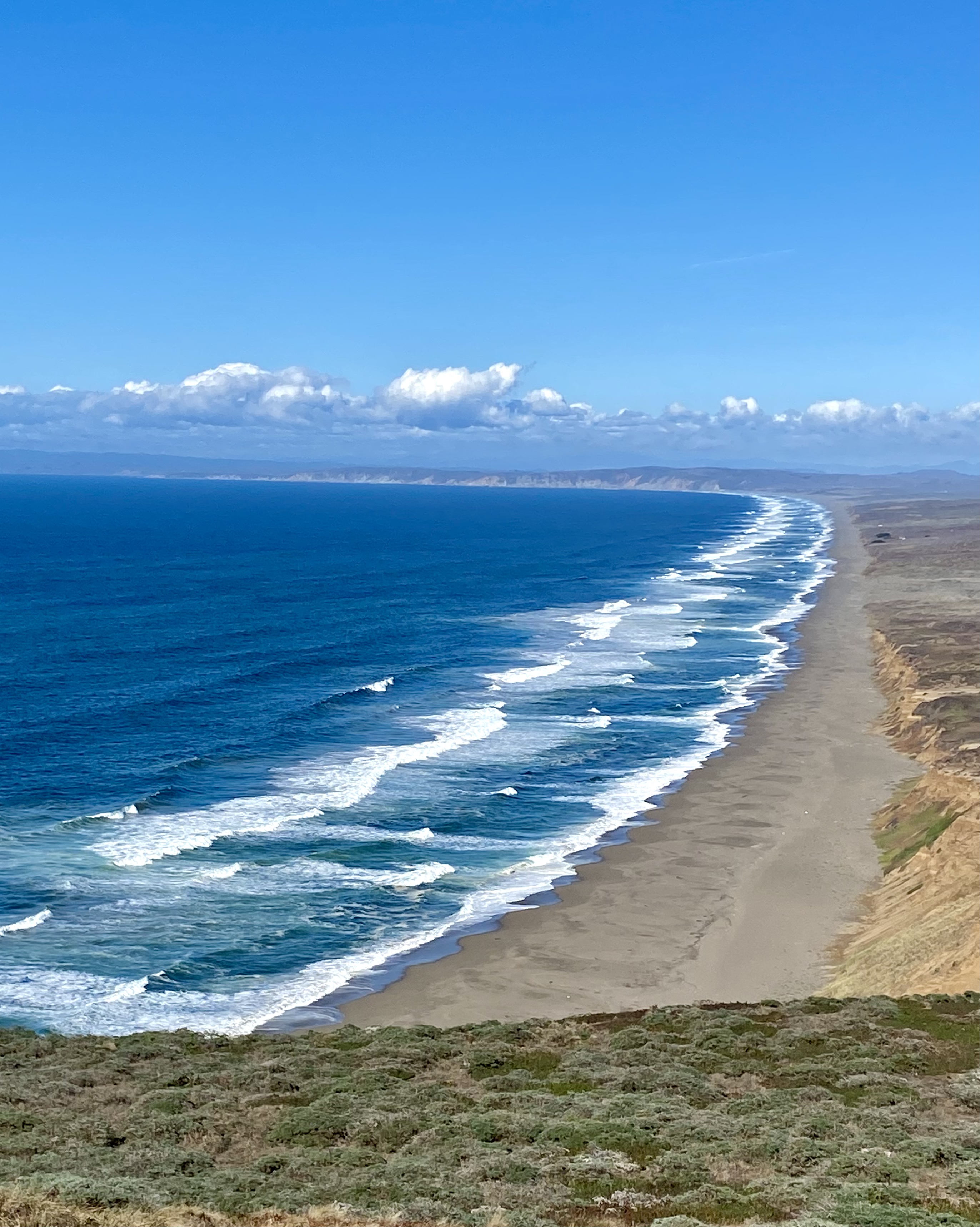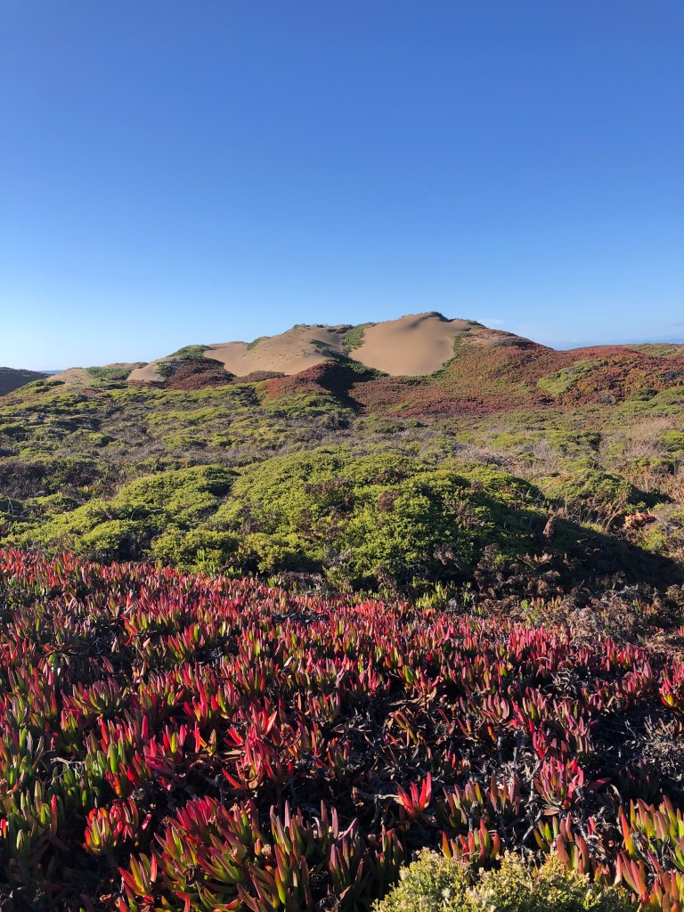 Much of the shoreline is sand dunes, often covered by a pretty green and red succulent that seemed to be keeping the area stable, at least preventing the wind from blowing the sand around. This is ice plant, which was introduced to the region from South Africa in the early 1900s for erosion control.