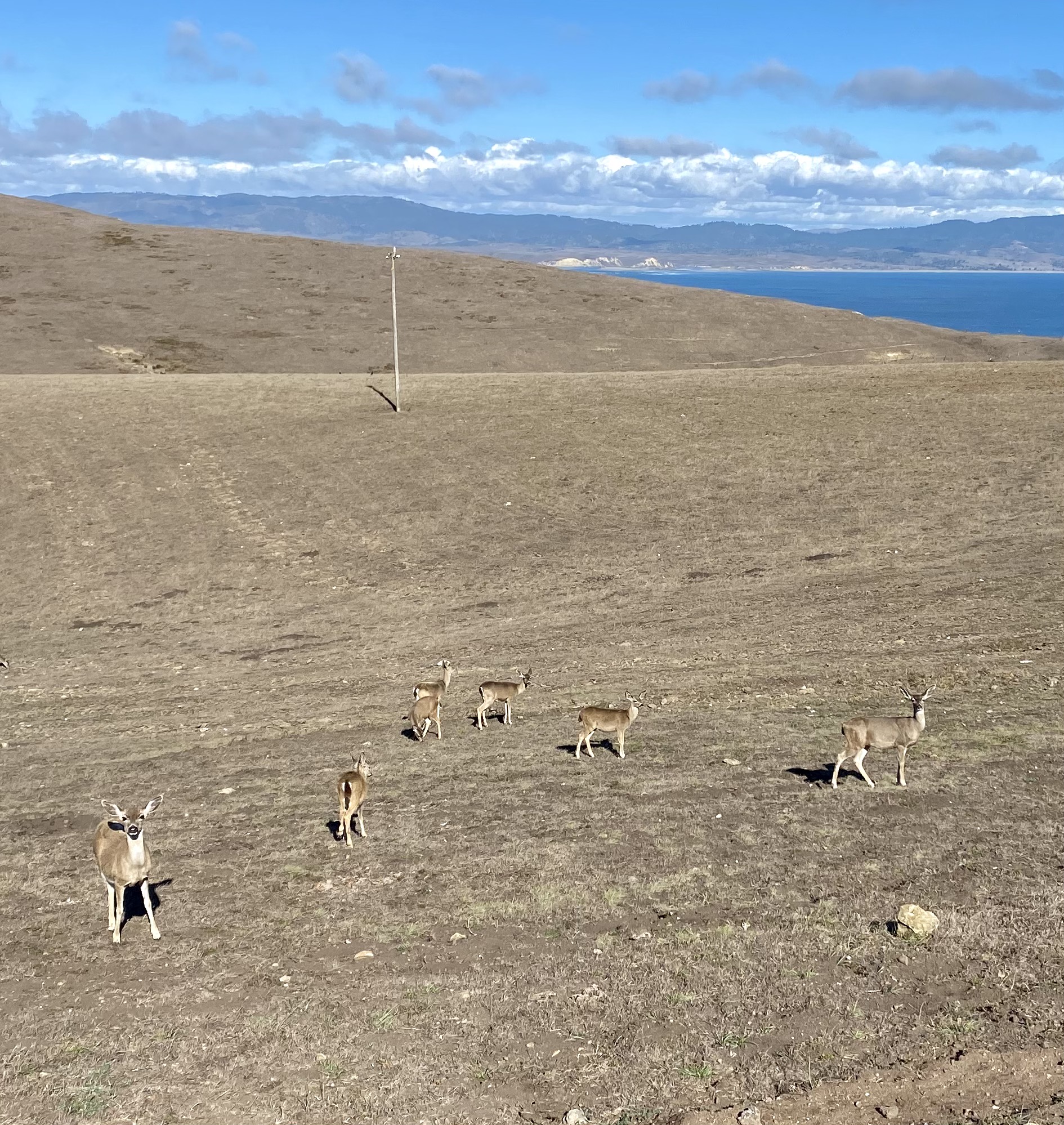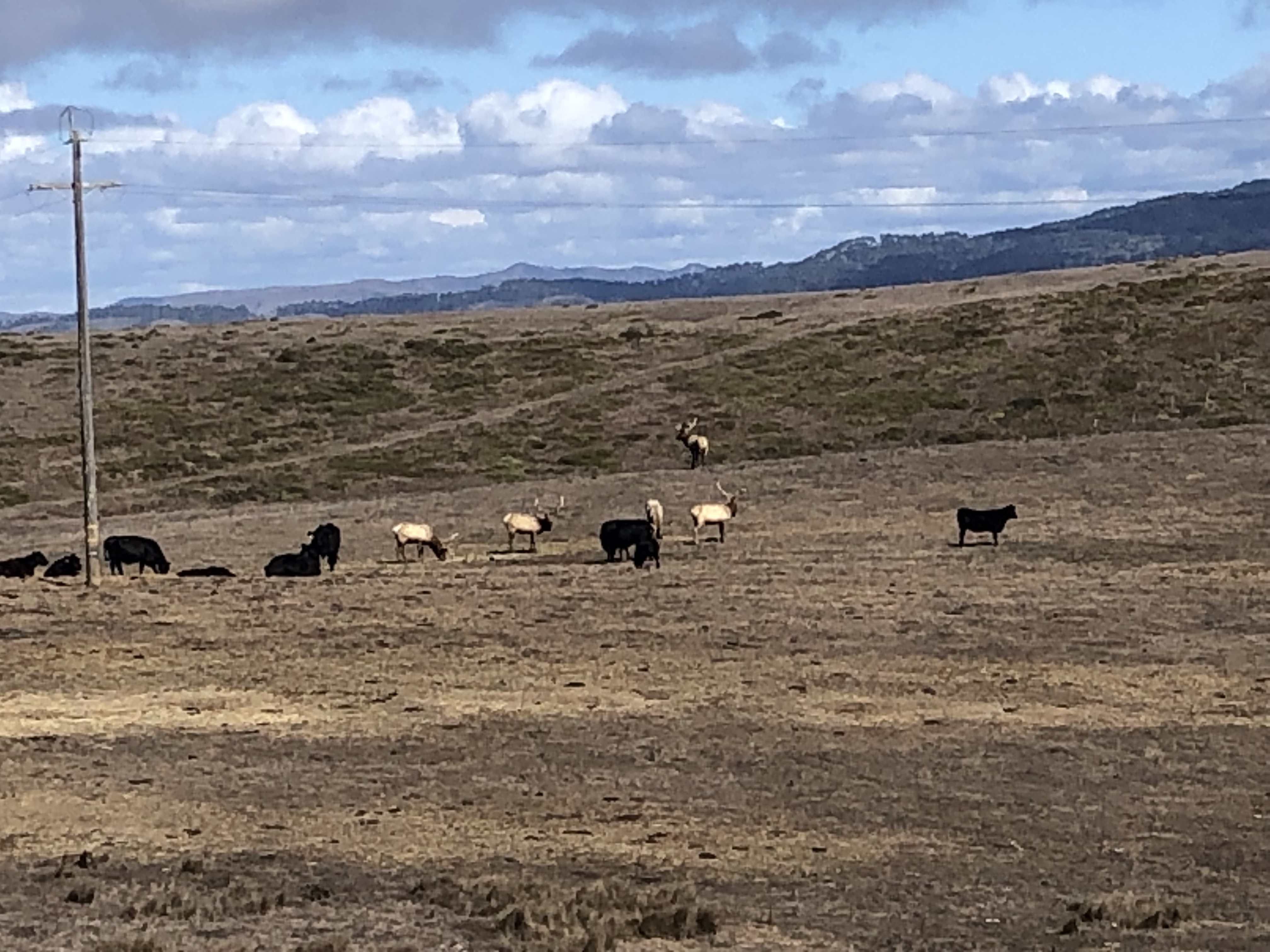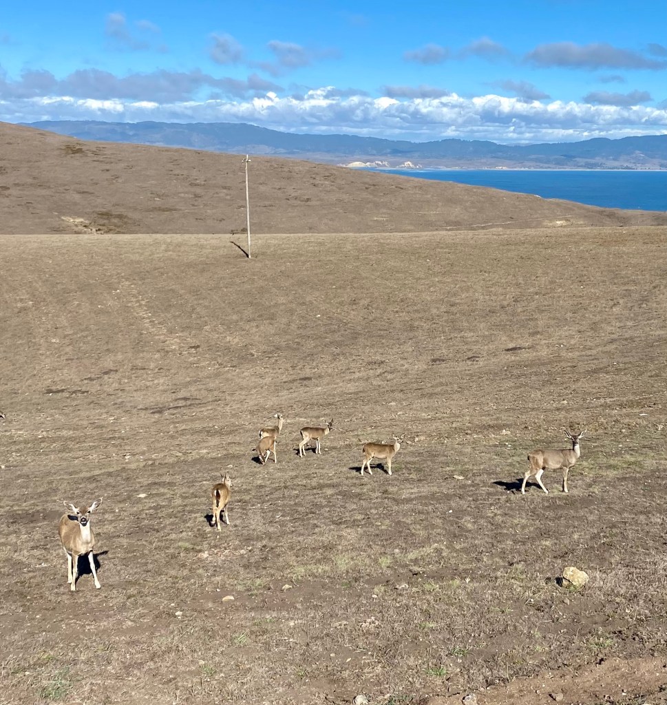 Surprisingly this turned out to be a wildlife tour, almost as good as Yellowstone National Park. Unfortunately, we weren’t expecting so much variety of flora and fauna, so we had only our i-phones, not the best for capturing animals at a distance. We saw elk with huge sets of antlers. These are not the same elk that we met in the Tetons; they’re tule elk, endemic to California. The species was almost extinct in the 1800s, but a small herd was nurtured and the population in the area is now roughly 400. We crossed paths with about 50 of them (at a distance, of course). Interestingly, the males seemed to hang around with their buddies without fighting or trying to rule a harem of females. They even mingled with the local cow population.