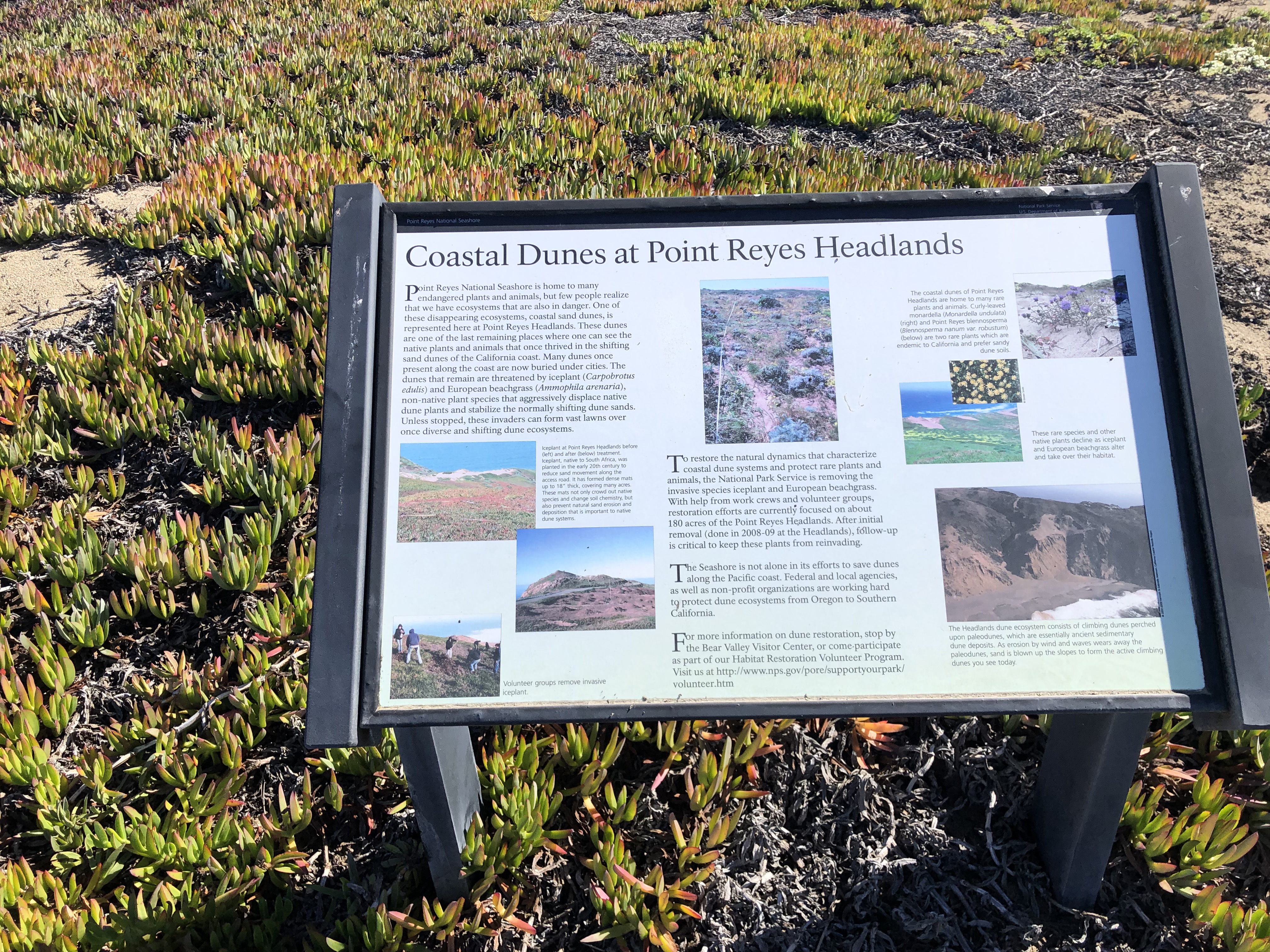 Unfortunately ice plants are hugely invasive, taking over anywhere they are planted and spreading rapidly. They prevent native species from getting water and nutrients, killing off any other vegetation. They don’t actually control erosion because the sand shifts under their shallow roots. So various efforts have been undertaken to try to remove ice plant. We learned about this from an information plaque that praised the efforts of volunteers to remove ice plant from 180 acres of the Point Reyes Headlands. The plaque was, you guessed it, in the middle of an invasive mat of ice plant.