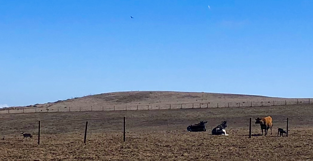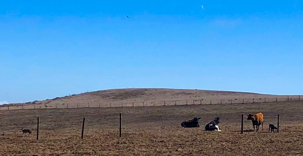 Several large herds of cows were free-ranging during the day and then headed to crowded barn lots in the late afternoon. We stopped to watch a coyote eyeballing one small group of cows with a newborn calf, probably hoping for dinner. He ran off when we started eyeballing him.