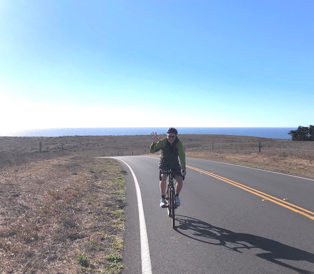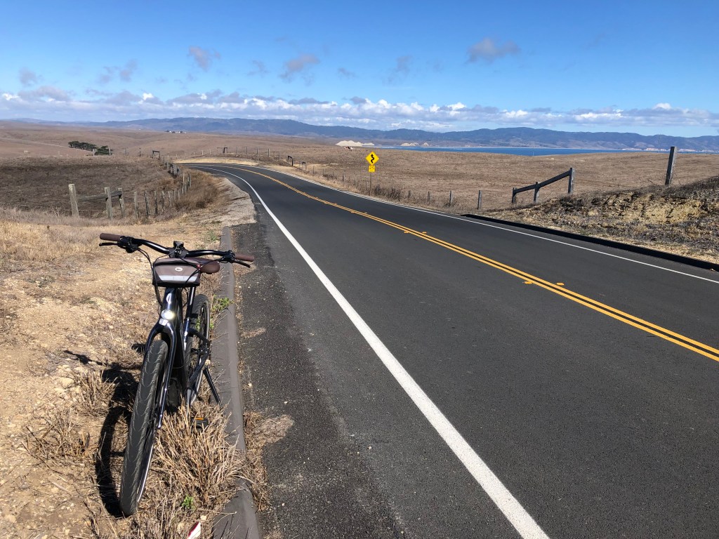 We did just a short ride, 8.5 miles each way, from Point Reyes Beach North to the Point Reyes Lighthouse. But along the round trip we made 2,400 feet of elevation gain, with slow pedaling uphill. Thank goodness for an e-bike for Nancy and strong legs and lungs for Michael.