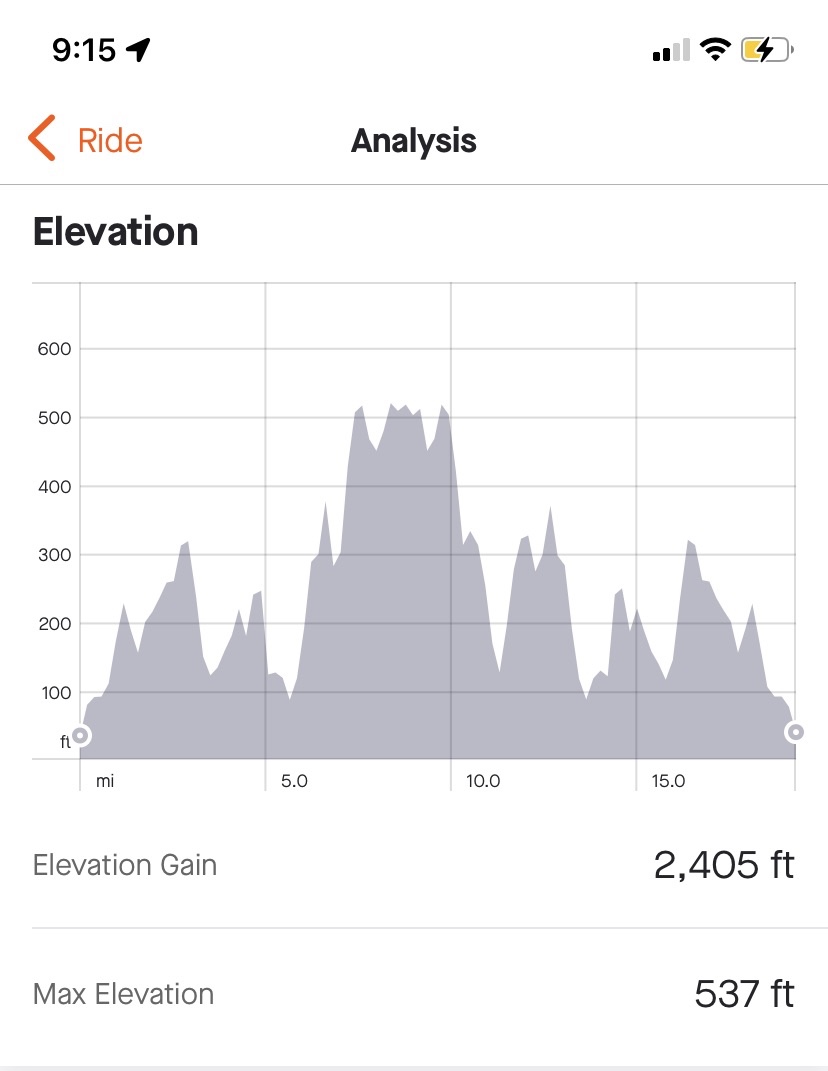 Here’s a Strava map showing elevation changes out and back.